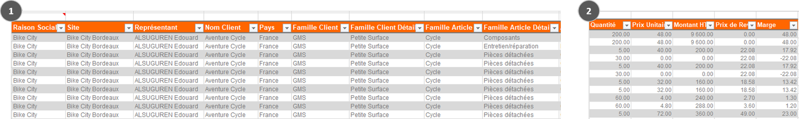 Pour exploiter au maximum vos données et profiter des fonctionnalités offertes par la plateforme de Datavisualisation, il est important de penser les indicateurs souhaitées dès la conception du tableau office, en multipliant les champs de critère / de segmentation (1), ou bien en prévoyant assez de champs de type valeur (2).